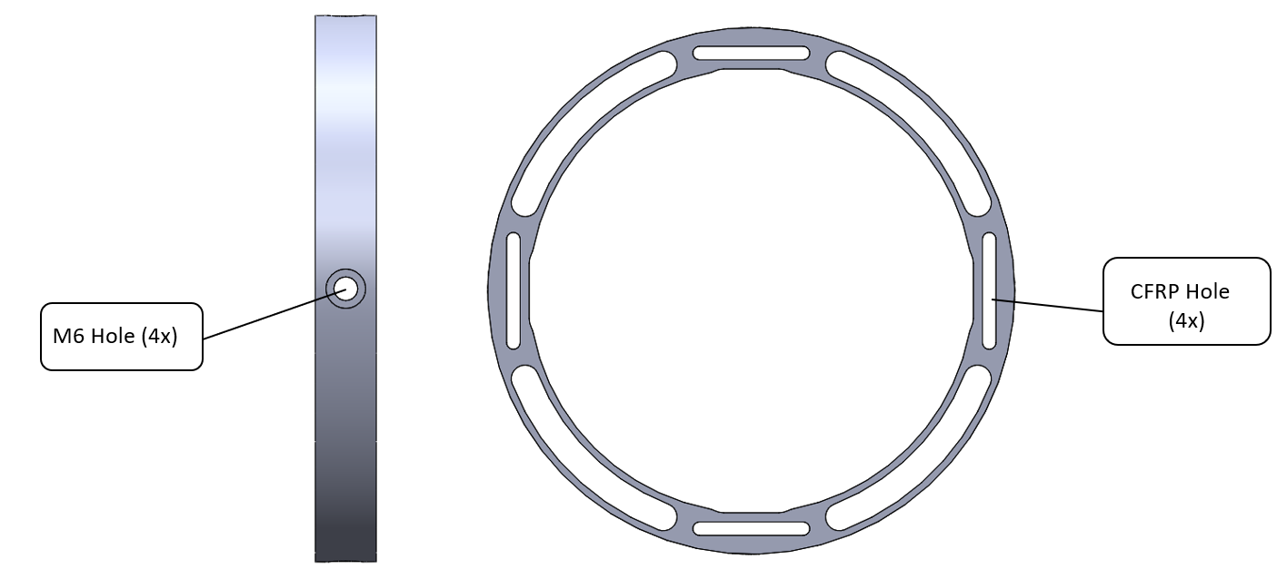Simulations on our CFRP rods show that the resistance force of the AB needed to prevent ONE rod from buckling is 200N. Taking into account a security factor of 2 , we assumed that every rod applied a force of 400 N on every AB ring, and more specifically on the inner surface of the CFRP hole (this of course is dictated by the direction of buckling).